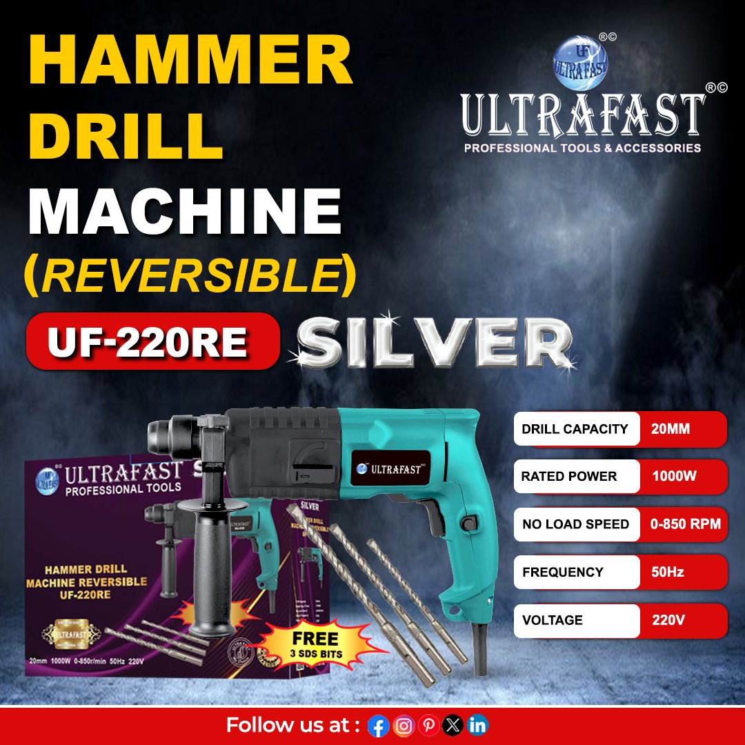 The Ultrafast UF-220RE Reversible Rotary Hammer is a high-performance tool tailored for precision drilling, chiseling, and reverse-mode extraction tasks. Featuring a 1000-watt copper-wound motor and 0–850 RPM speed control, it powers through concrete, brick, and stone with ease. The 20MM SDS-plus mechanism offers fast bit swaps and maximum drilling efficiency. With added reverse functionality, this tool is perfect for professionals working in tight angles, overhead tasks, or extraction situations. Engineered under the Silver Series, the UF-220RE ensures durability, reduced vibration, and consistent performance on site—ideal for contractors, electricians, and structural workers who value precision and endurance.