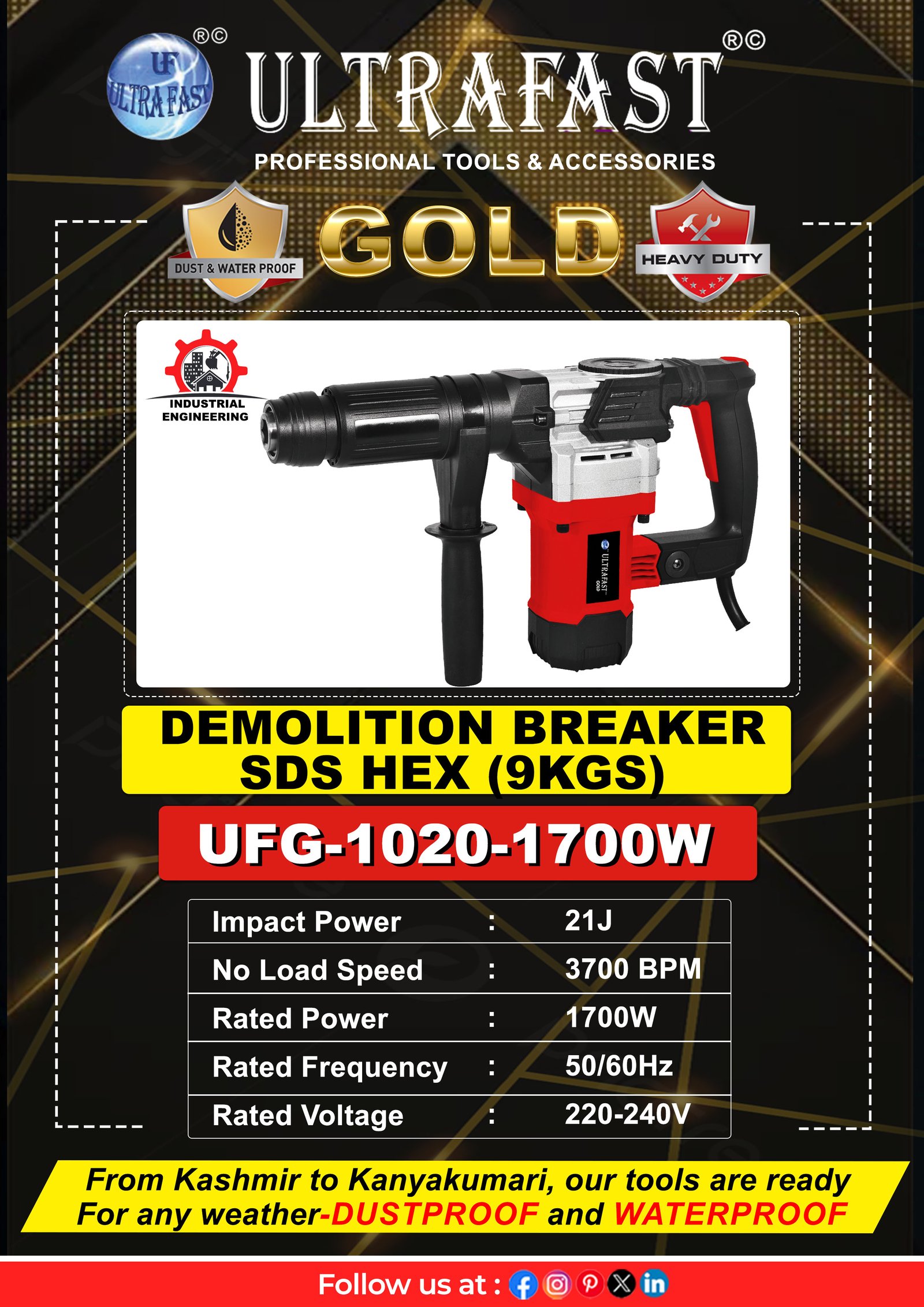 The UFG-1020 Demolition Breaker delivers reliable power and efficiency for tough demolition tasks. With 21 joules of impact energy, 3,700 BPM, and a strong 2200-watt motor, this SDS HEX breaker smashes through concrete, masonry, and stone with ease. Its waterproof and dustproof construction ensures long-lasting durability, even in the harshest job site conditions. The ergonomic design provides superior control and comfort, reducing user fatigue during heavy-duty work. Ideal for contractors, construction crews, and renovation professionals, the UFG-1020 offers exceptional breaking performance, power, and reliability — making it an essential addition to your demolition toolkit.
