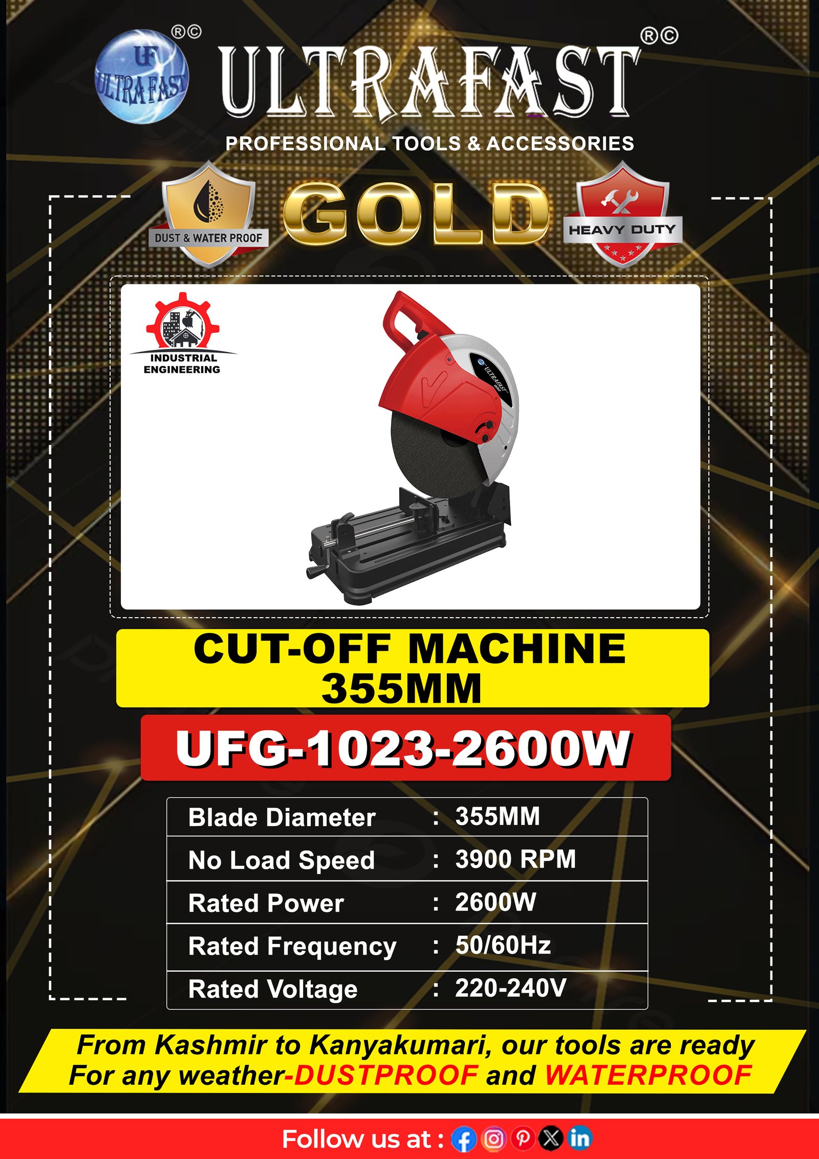 UFG-1023 Cut Off Machine 355mm delivers powerful, precise cutting for metal, pipes, and construction materials. Equipped with a heavy-duty 2600-watt motor and 3,900 RPM speed, it ensures fast, efficient performance on tough jobs. Built for durability, its waterproof and dustproof design withstands harsh job site conditions. The ergonomic handle and stable base provide enhanced control, safety, and cutting accuracy. Ideal for workshops, fabrication units, and professional contractors, the UFG-1023 offers clean, consistent cuts with every use. Whether you're handling daily tasks or heavy-duty projects, this machine is a reliable addition to any industrial cutting setup. Boost productivity and precision with the UFG-1023.