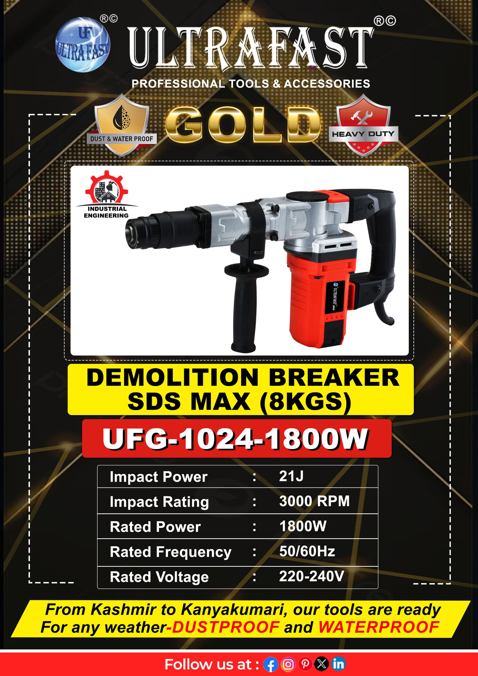 The UFG-1024 Demolition Breaker is built for precision and power in demanding demolition work. Delivering 21 joules of impact energy at 3,000 BPM and powered by a strong 1800-watt motor, this SDS Max breaker makes quick work of concrete, brick, and masonry. Its waterproof and dustproof design ensures long-lasting durability, even under harsh job site conditions. Designed with an ergonomic grip and advanced vibration control, it provides excellent handling and reduces operator fatigue. Perfect for professional contractors, builders, and renovation experts, the UFG-1024 offers superior breaking force, efficiency, and reliability for heavy-duty demolition projects.