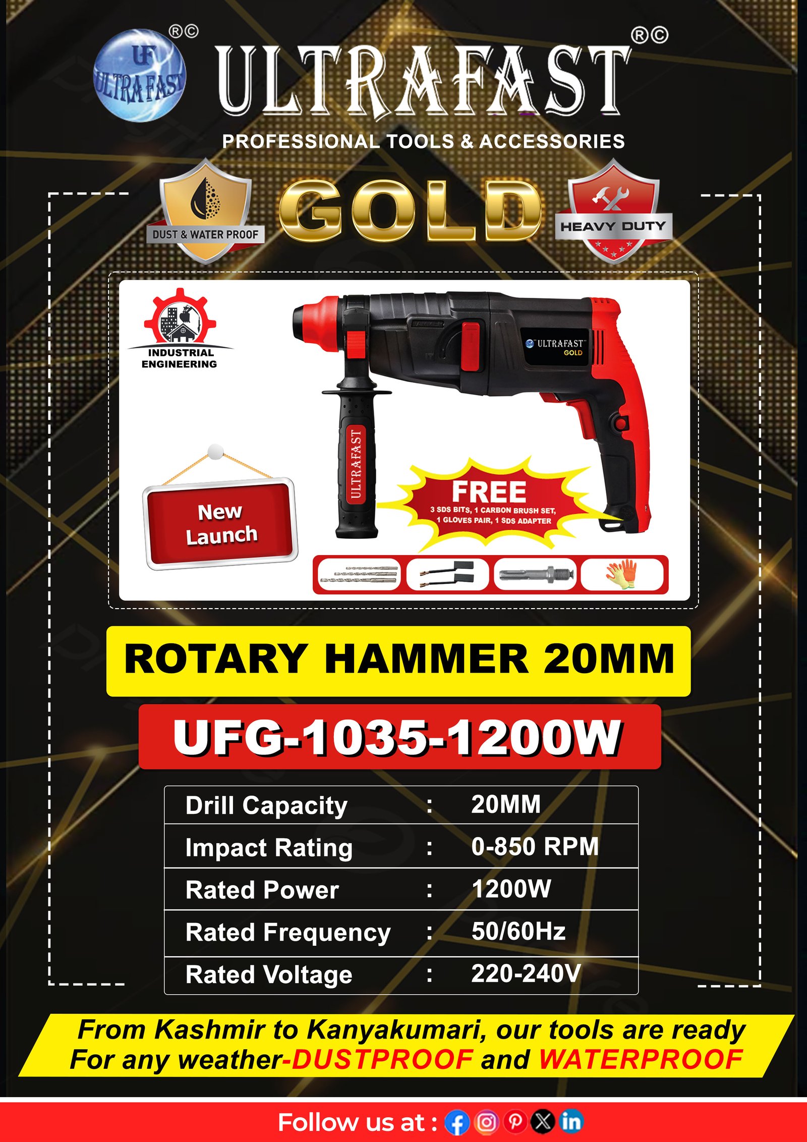 The UFG-1035 Rotary Hammer 20mm is a compact yet powerful tool, perfect for precision drilling and light chiseling in concrete, brick, and masonry. Equipped with a 1200-watt motor and 0–850 RPM, it delivers smooth, efficient performance on a variety of tasks. Its lightweight, ergonomic design ensures maximum comfort and control, reducing user fatigue even during long jobs. Built for durability and reliability, the UFG-1035 is ideal for contractors, electricians, and DIY enthusiasts who need a versatile and dependable rotary hammer for daily use. Get superior results with this efficient and user-friendly tool.