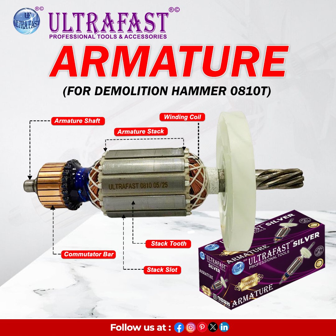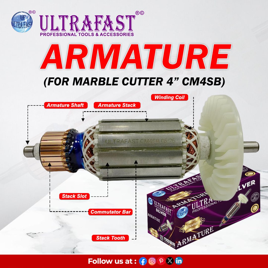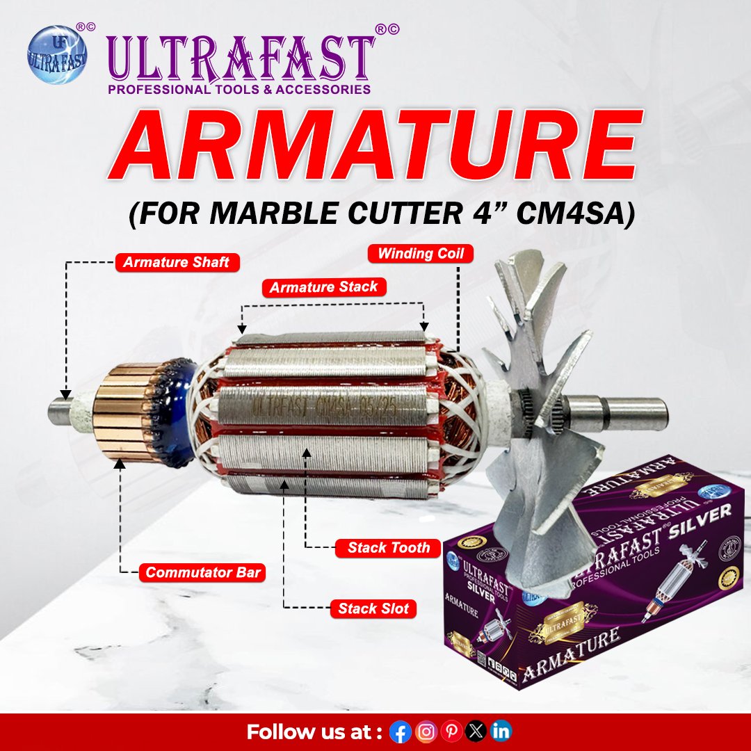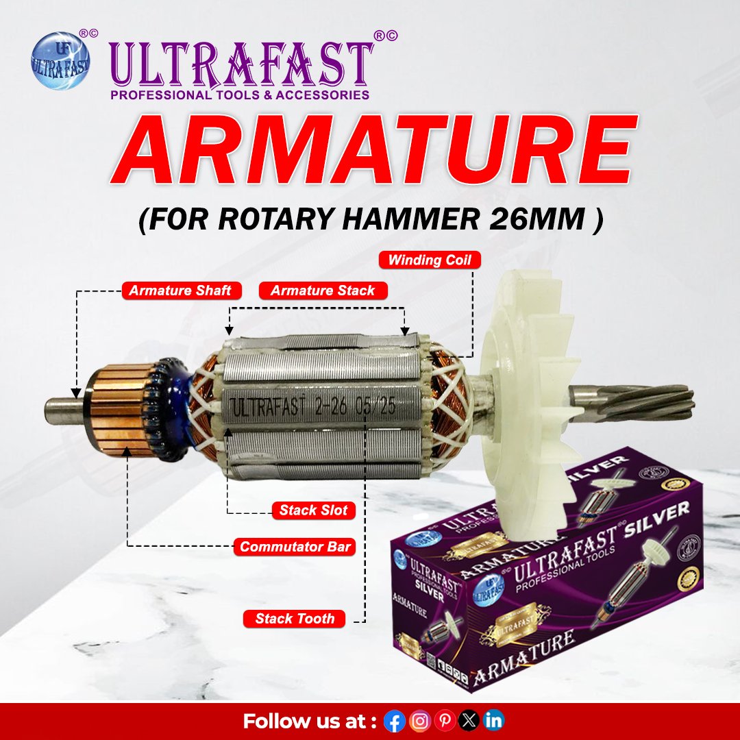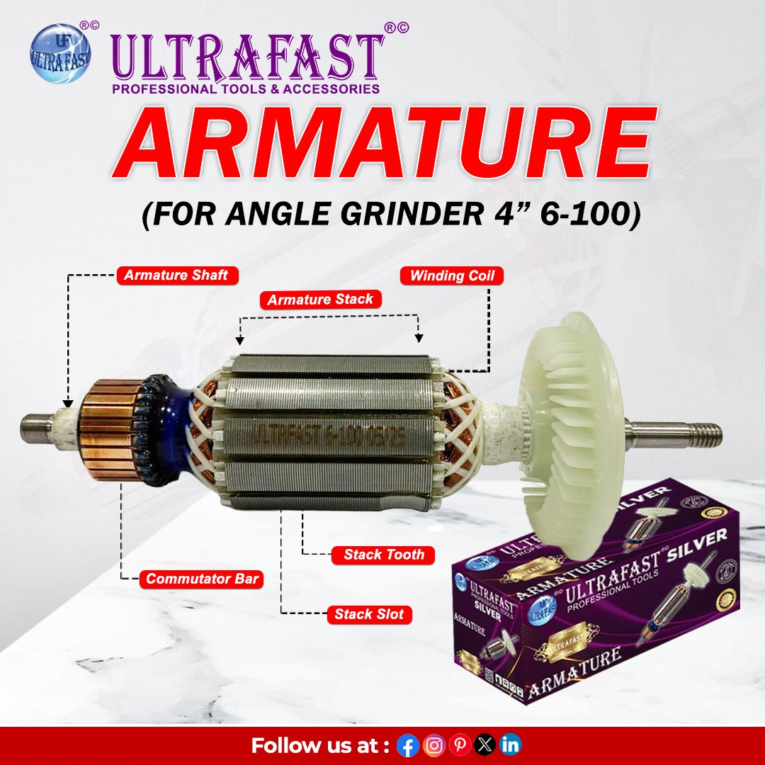The Ultrafast Armatures are precision-engineered components designed to deliver reliable performance in power tools and electric machines. Manufactured with high-quality copper wire and durable steel laminations, these armatures ensure efficient current flow, reduced heat build-up, and long service life. Perfectly balanced for smooth operation, they minimize vibration and enhance tool efficiency. Suitable for a wide range of applications, Ultrafast Armatures are compatible with drills, grinders, cutters, and other professional-grade machines. Trusted by technicians and repair professionals across India, they offer consistent durability, high torque output, and dependable performance for heavy-duty industrial as well as domestic tool use.