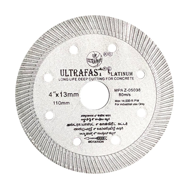 The Ultrafast Concrete Master Turbo – Platinum Series is engineered for professional-grade concrete cutting, featuring a 13mm high segmented rim for extended blade life and aggressive cutting performance. Designed for deep, efficient cuts, this blade excels in reinforced concrete, RCC walls, pavement blocks, and construction-grade masonry. With its turbo segment design, the blade ensures rapid material removal, minimal heat buildup, and reduced vibration, delivering smoother operation and clean finishes—even under heavy workloads. Ideal for use in wall saws, concrete cutters, and handheld machines, it performs exceptionally well in both wet and dry conditions. Favored by contractors and infrastructure professionals across India, the UF Platinum Series Turbo Blade guarantees long-lasting sharpness, durability, and maximum reliability for demanding concrete cutting applications.